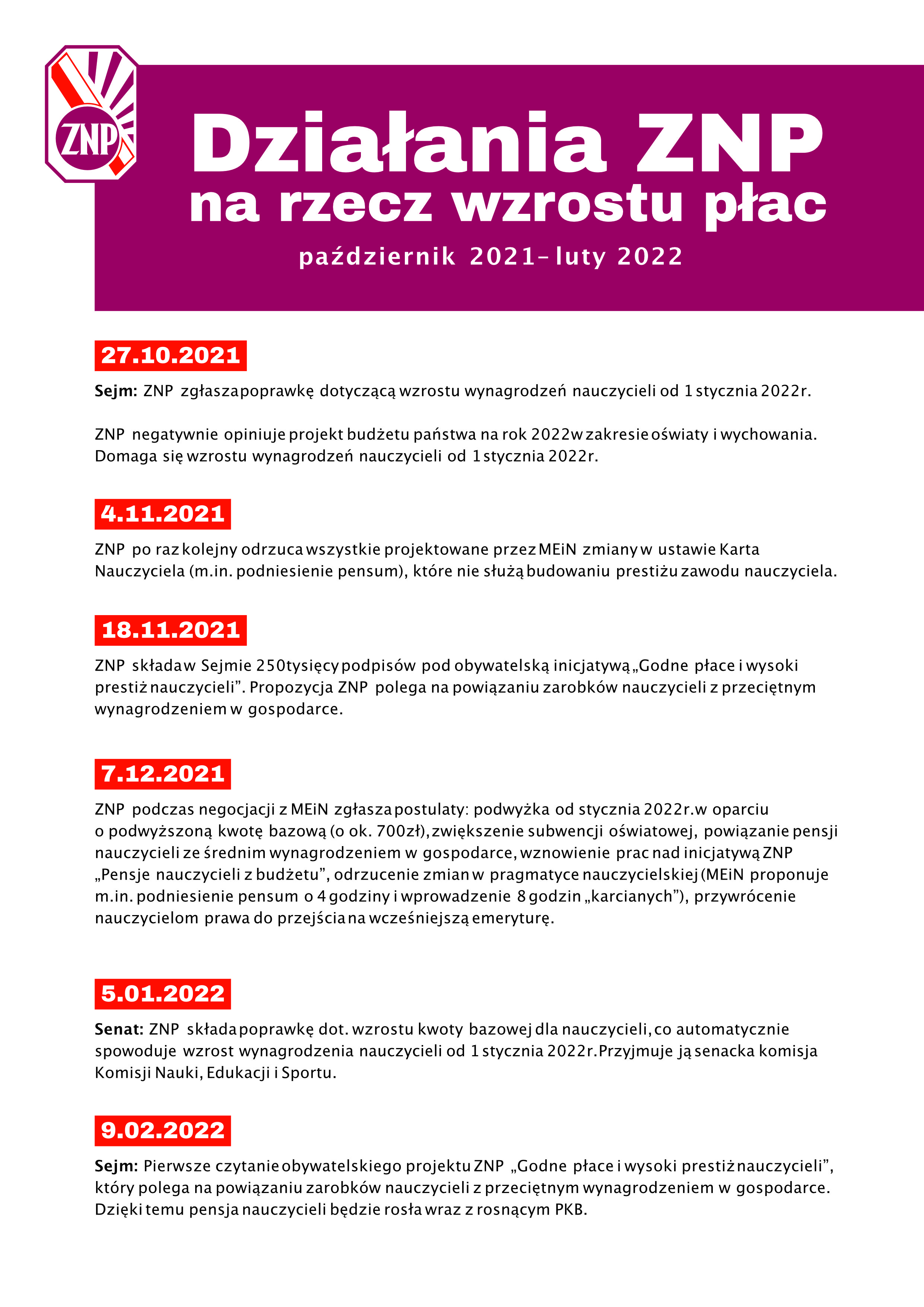 Związek Nauczycielstwa Polskiego i WZZ „Forum – Oświata” informują, że aktualne są wspólne ustalenia zawarte w porozumieniu związków zawodowych z 13 października 2021 r., zgodnie z którymi domagamy się wzrostu wynagrodzeń oraz: