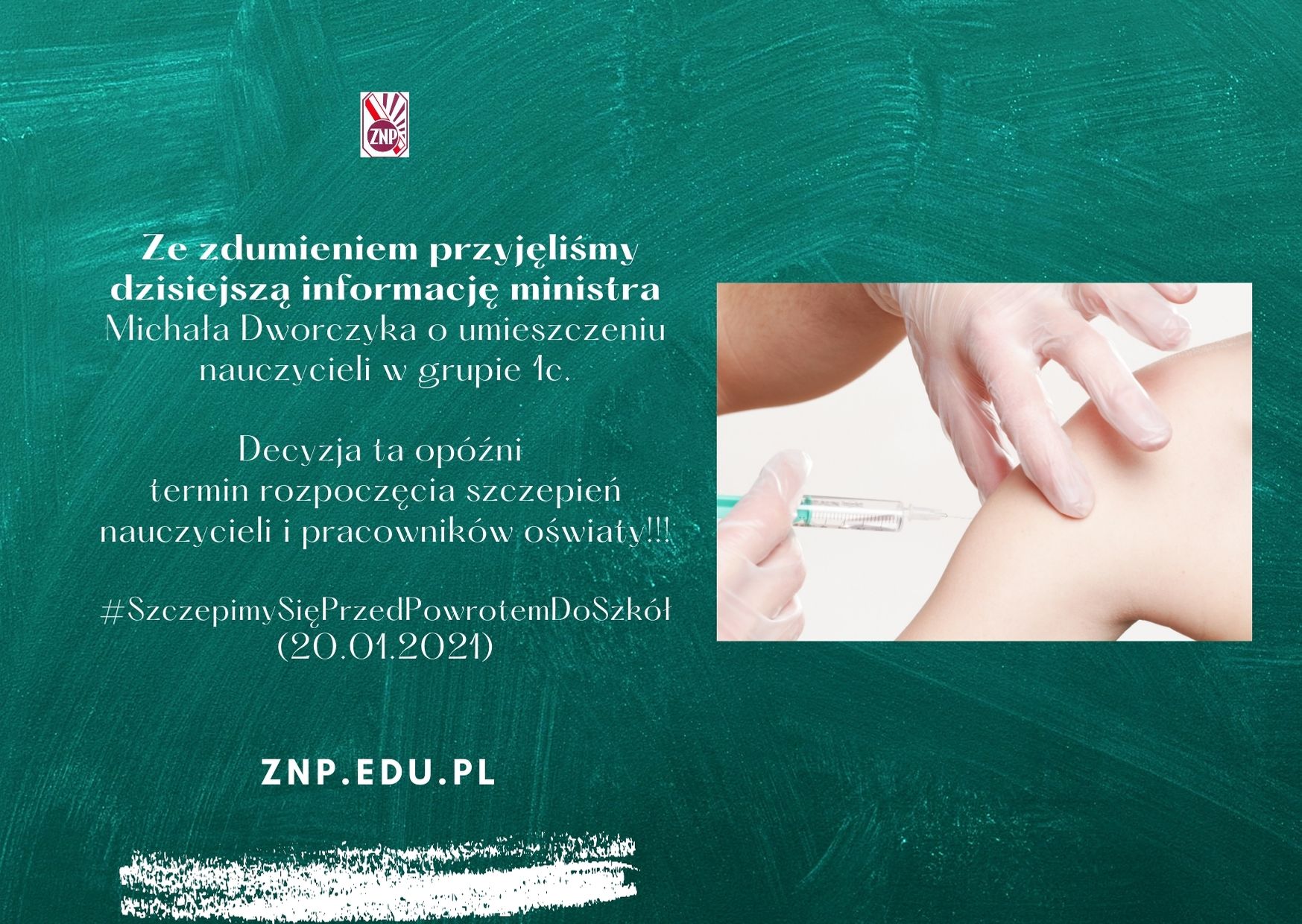 Ze zdumieniem przyjęliśmy dzisiejszą informację ministra Michała Dworczyka, pełnomocnika rządu ds. szczepień o umieszczeniu nauczycieli w grupie 1c. Decyzja ta opóźni w czasie termin rozpoczęcia szczepień nauczycieli i pracowników oświaty. Uważamy, że nauczyciele powinni być szczepieni na równi (nie przed) z innymi grupami uwzględnionymi w etapie I.