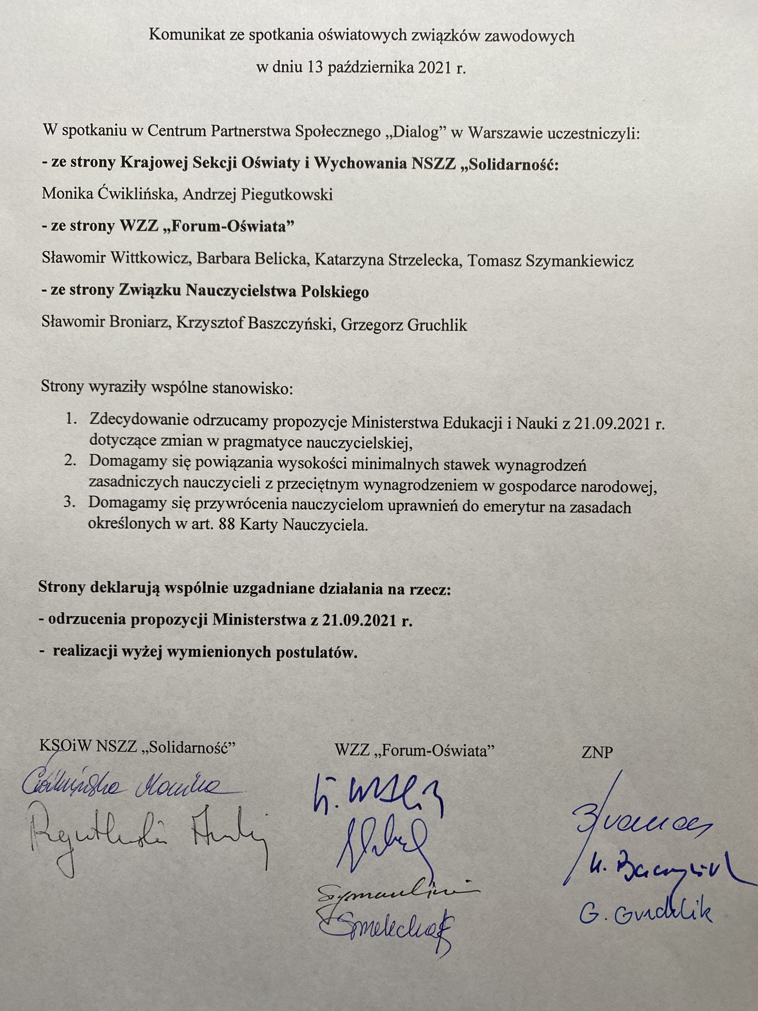 13 października odbyło się w Centrum Partnerstwa Społecznego „Dialog” spotkanie przedstawicieli trzech oświatowych związków zawodowych dotyczące propozycji MEiN przedstawionych związkom zawodowym 21 września br.