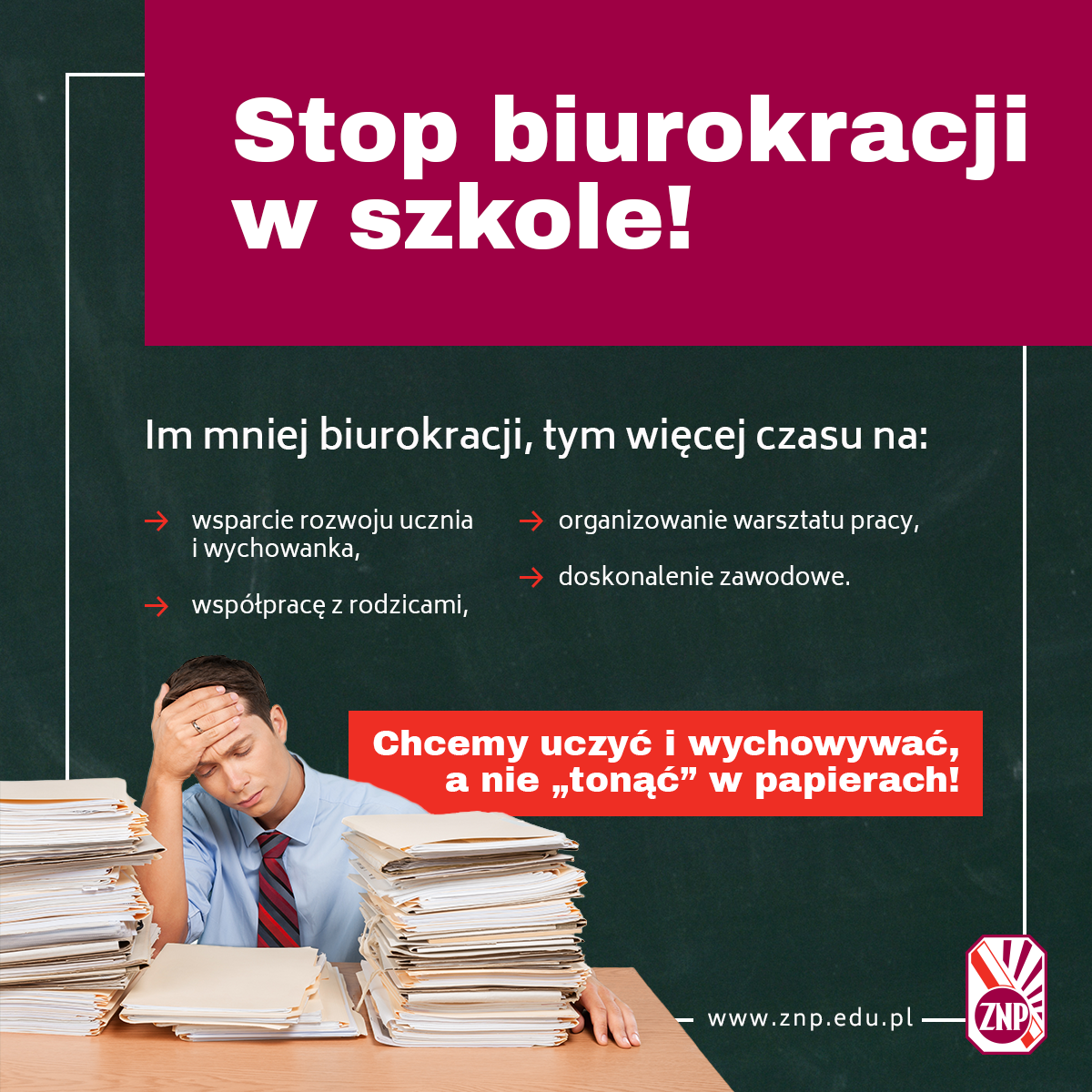 W związku z pismem wysłanym w przez resort edukacji w dniu 16 listopada 2021 roku do dyrektorów szkół i placówek oraz organów prowadzących szkoły i placówki dotyczącym ograniczenia obowiązków nauczycieli związanych z dokumentowaniem ich pracy – nadmiarem biurokracji, Związek Nauczycielstwa Polskiego przeprowadził w dniach od 29 marca do 31 maja ankietę online dotyczącą biurokracji w szkołach. Odpowiedziało 10 620 ognisk ZNP. Zadano w niej cztery zamknięte pytania. Odpowiedzi na nie przedstawiają się następująco: